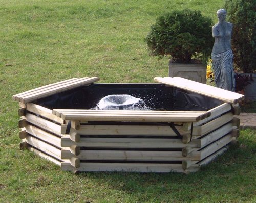 GARDEN POOL 100 GALLON WITH LINER & PUMP:This wooden garden pool is very easy to assemble - average build takes just 15 mins. Only 6 screw used in whole assembly, no digging, no plumbing. This 100 Gallon Pool makes a great water feature and is so quick and easy to assemble, you'll wish you bought it sooner!Wood is Pressure treated for longer life. Hexagon shape design measure: 1.67m (5' 6") x 41cm Depthpump pool liner Fountain heads Intalogs wooden pool