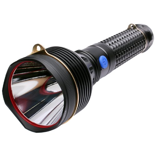 The Olight SR95UT Ultra Throw Intimidator is a rechargeable LED torch which breaks the magic mark of a 1000m beam! With an astonishing max 1250 Lumen output and an incredible beam range of 1000m all in a rechargeable, handheld flashlight . A perfect Search And Rescue torch also suitbale for outdoor ventures, hunting, marine navigation, and much more. Supplied in its own aluminium flight case, complete with a shoulder strap, batteries and a charger. Waterproof to level IPX-6, it also has an invaluable 4 stage battery level indicator on the tailcap. - Max Lumens: 1250 - Beam Range: 1000m - Typical battery burn time: High (1250 lumens) = 3 hours, Medium (500 lumens) = 8 hours, Low (150 lumens) = 48 hours - 3 Light mode options : High - Medium - Low - Non-focusable - Easy charging through socket in tail-cap - Ultra Luminus SBT-70 LED - easy reach barrel mounted switch - Type III hard-anodized body - Anti-scratch, anti-slip knurled design - Waterproof to IPX6 - Charging status indicator - Battery status indicator - Length: 12.79" (325 mm) - Head Diameter: 3.55" (90.17 mm) - Weight with battery: 43.38 oz. (1230 g) - Battery Required: Li-ion rechargable battery (included) - Official Olight product - Supplied in its own aluminium flight case, complete with a shoulder strap, battery pack and a charger (UK 3 pin plug)