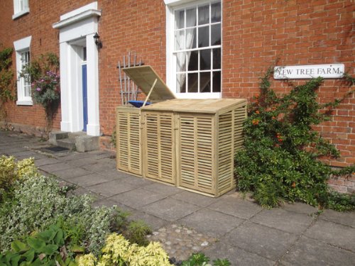 This new Fsc triple wheelie bin cover comes complete with a solid top so that it can be used for log storage. This 3 piece item has already been pre-treated to Adolit Bq1. The treatment is light green in colour, but it will fade as the timber is exposed to weather conditions. The product will arrive boxed and flat packed, it should only take 10 minutes to assemble it. For those who need to accommodate their wheelie bins in the front garden there is another great benefit, the wheelie bin covers are lockable, so they can be secured against neighbours and passers-by, and, of course, with wheelie bin covers, the front of your house will always retain its kerb-appeal, with your bins conveniently handy yet still screened out of sight.