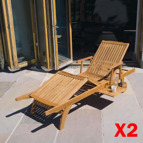 Pair Of Premum Quality Garden / Patio Furniture - Balau Hardwood Sun lounger Chair X2 On Wheels Fully Adjustable With Drinks Tray