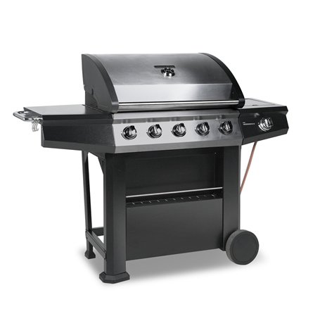 This stylish stainless steel five burner gas barbecue has a double layer stainless steel lid with stamped steel end caps and a handle. The sturdy BBQ unit has two side shelves for convenient food preparation and is set on front wheels for easy mobility. 5 stainless steel burners and side burnerDouble layer stainless steel hoodPorcelain coated steel cooking gratePorcelain coated steel warming rackIntegrated control knob piezo ignitionFlame tamer2 x side shelvesGrill cover and regulator includedComes with cover & regulatorTotal cooking area 3637 cm sqDimensions: 124cm H x 53cm D x 148cm W
