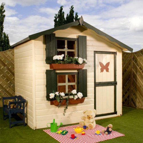This is the magnificent 7' x 5' Honeypot Snowdrop Cottage with Loft Playhouse, clad in traditional tongue and grooved manner and its roof and floor built from solid sheet materials. It is a double storey playhouse which means that it offers double the fun and excitement. To ensure that the children remain safe in the playhouse, we have left a 12mm gap around the door frame which means that children cannot get their hands trapped in the door and hurt themselves. The ladder inside the playhouse possesses non-slippery treads that don't let the children slip as they run up and down the steps. This playhouse meets the EN71 European Toy Standards, which confirms the fact that these buildings are completely safe for your child.