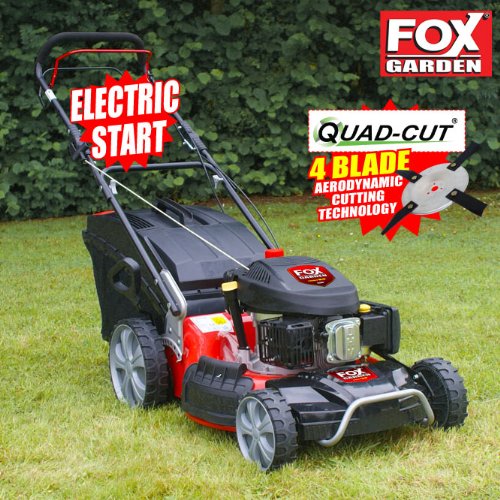 Fox 21" Electric Start Quadcut Petrol Lawn Mower. LIST PRICE: 649.99.SAVE A MASSIVE: 220.PRE-SEASON PRICE: 429.99. Our engineers will custom build and deliver to.For large gardens where the ultimate performance from a pedestrian controlled self propelled mowers is required, FOX delivers. Giving a razor type cutting performance, you will be delighted with the results from your FOX 21" QUAD-CUT mower! Fitted with the special 4 blade cutting technology of "QUAD-CUT", this system operates at 200mph and cuts at double the efficiency of a conventional mower. Fantastic design, Fantastic quality, Fantastic performance, Fantastic lawn, Fantastic FOX! Specification: SELF PROPELLED WITH COMFORT GRIP HANDLE. ENGINE: WOLF 6.5HP (200cc) 4-STROKE OHV. ELECTRIC START. CUTTING WIDTH: 21" (530mm). WHEEL Dia.: FRONT 8" / REAR 11" FOR MAXIMUM TRACTION CONTROL. SINGLE LEVER HEIGHT ADJUSTER - 7 HEIGHT SETTINGS BETWEEN: 22 - 82mm. LARGE 75L GRASS COLLECTION BAG. ENGINE SPEED CONTOL, (WALK BEHIND AT YOUR OWN PACE). 4 IN 1 CUTTING FACILITY: MULCHING, COLLECTING, REAR DISCHARGE & SIDE DISCHARGE. ADJUSTABLE HANDLE HEIGHT. DECK CLEANING FACILITY. FRONT PROTECTION BAR. FITTED LAWN STRIPER. 4 BLADE QUAD-CUT CUTTING TECHNOLOGY. WEIGHT: 44KG.