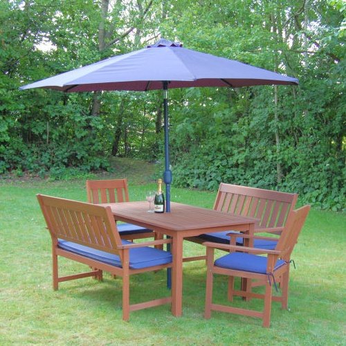 A suberb value garden furniture patio set comprising of a hardwood table, two bench seats and two substantial armchairs. This quality garden set is made from Acacia hardwood sourced from sustainable, well-managed plantations. It has higher backed benches and deeper chairs than usual for more comfort. The Monaco Bench Set is one of the best patio sets available at an astonishingly low price for the quality.This set is comprised of five pieces: Table, two armchairs and two bench seats. This set will compliment any patio or garden and will be both useful and stylish for years to come. Our wooden furniture can be left outside all year round, but we recommend it is treated regularly with a hardwood oil and is covered when not in use. Table: 140 x 80cm