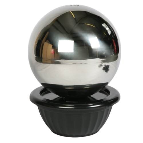 Water flows over and around the stainless steel sphere in this relaxing water feature. Four white LED lights light the water from the top creating a stunning effect at dusk and night.This water feature was featured in BBC's Digging Deep and also in Channel Four's Big Brother House.The 50cm sphere is fully self contained and self circulates the water from the larger plastic resevoir which can either be sunk into the ground and covered with pebbles or placed into a large ceramic pot and again the plastic sump decorated in polished pebbles or slate.