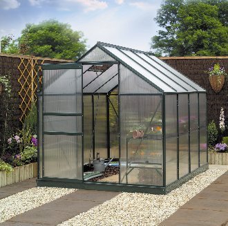 This greenhouse is an aluminium house with a green enamelled coating for long life which prevents the greenhouse from tarnishing or fading. The greenhouse comes with polycarbonate glazing which is strong and very safe and is virtually unbreakable and easy to handle. Horticultural glass is thin, easily breakable and when it does break it is very sharp and dangerous. Our polycarbonate glass has a twin wall construction which actually provides an excellent growing environment and good insulation from frost - perfect over the winter. It maintains an even temperature for better plant growth