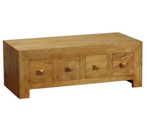- 115x55x42cm, 42 cm High 8 drawers for DVDs etc. Hand Waxed Lacquered Solid Mango Wood Coffee Table