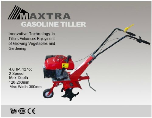 This lightweight easy to use yard and garden cultivator has a 4.0HP, 127CC, 4-stroke single-cyclinder air cooled industrial OHV engine, cultivating depth up to 120-260mm and cultivating width up to 360mm. Makes this easy to handle and gets the job done. With a heavy-duty gearbox, fingertip throttle control and a clutch handle, it provides a consistent transmission of power to tines under varying soil conditions. GS, CE, TUV approved.