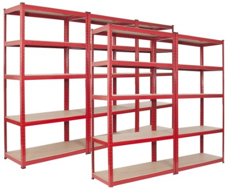 Total Size 1800mm x 4500mm x 450mm5TIER STEEL SHELVING UNIT in RedHeavy duty weight capacity of 275kgs Per Shelf Heavy Duty Steel with Powder Coating Shelf : Superstrong MDF board 7mm ( not Chipboard ! )Item just snaps together (no bolts required ) just use a rubber malletCan also be easily converted into a workbench