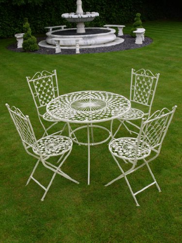 French Ornate Cream and Gold Bistro Garden Furniture Set 5 Pieces Wrought Iron Flower Metal Garden Table and 4 Chairs FOLDABLE