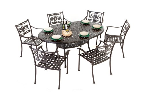 - A lattice table top design is perfect for the patio and the shaped table legs provide maximum leg room. We manufacture this oval outdoor setting with virgin aluminium, reclaimed metal has impurities that can cause cracking and distortion.
