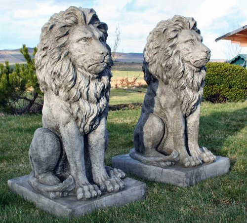 GLORIOUS PROUD LIONS,PRICE IS FOR THE PAIR.The detail and size makes these very impressive indeed.Fantastic for entrances, gates, patios ...they really will make a huge impression.Absolutely solid, each lion is set on a deep, heavy plinth making them extremely stable and happily freestanding.A very dignified and proud pair of Lions with great detail - you will not see better, and at this price are incredibly affordable!Heavy and frostproof.Each lion measures: H88cm, W42cm & L52cm and weighs 165kgIMPORTANT, PLEASE NOTE: WE DO NOT SHIP TO NORTHERN SCOTLAND, HIGHLAND & THE FOLLOWING POSTCODES AB, IV, KA, KW, PA, PH,& KA