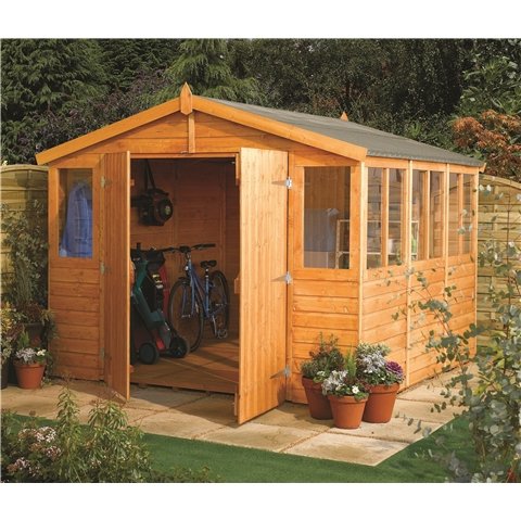 The Premier Workshop features high eaves and extra headroom giving you a generous large space for storing your bulky items and the large area makes a great workshop space.Construction The shed is constructed from high quality tongue and groove shiplap cladding which is supplied with a free factory basecoat dipped in a honey brown finish. The high quality floor joists give the shed a solid and sturdy feel. The floor is constructed from Tongue & Groove and the Roof from Solid OSB Board. The large fixed side styrene glazed windows provides plenty of light into your shed.Features 10 Styrene Fixed Glazed Windows - can be placed either side Two Fixed Front Windows Double Doors Lock & Key 29mm x 45m frame Ideal for storage of bulky equipment High Eaves for Extra Headroom Tongue & Groove Walls Wall Thickness 12mm Floor 12mm Tongue & Groove 9mm Solid OSB Sheet Material Roof 9mm Roof Full fixing kit including felt & instructions manual Pre-Treated with Timber Preservative Dipped in Honey Brown Finish Easy Assembly Quality Tongue and Grooved Cladding Green Mineral roofing felt Scandinavia FSC Pine (mixture of red & white) Pre-Treatment 10 YEAR ANTI-ROT WARRANTY FREE UK MAINLAND DELIVERY*